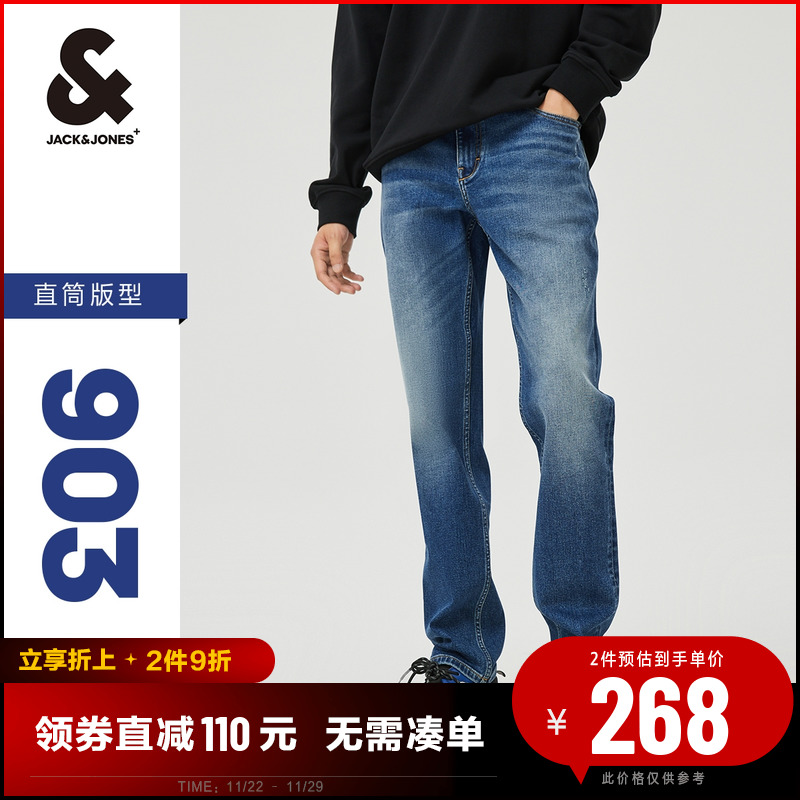 잭 존스 남성 스트레치 청바지 남성 조류 브랜드 백 스트레이트 팬츠 사계절 남성 바지 그래 핀 직물