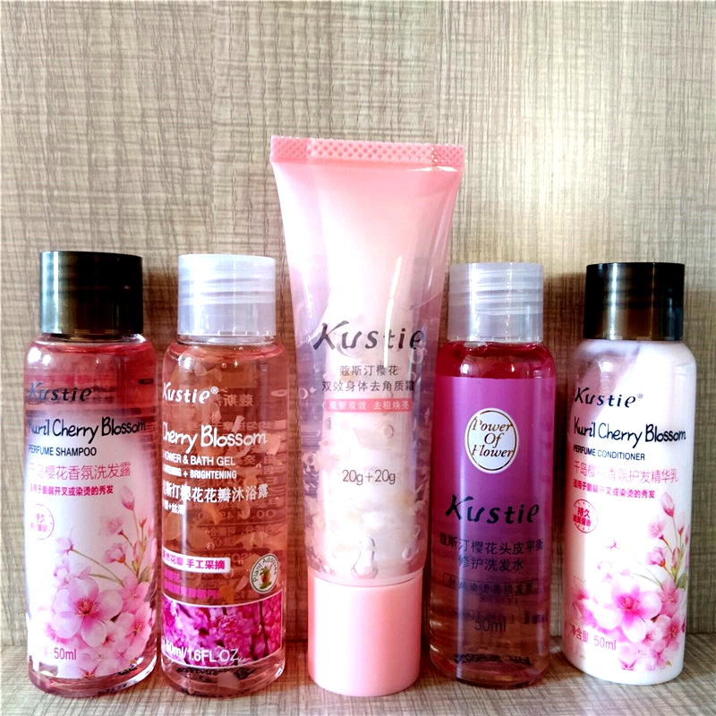 커스틴 샴푸 벚꽃 꽃잎 샤워 젤 바디 밀크 워시 세트 컨디셔너 여행용 샘플러 백 가방