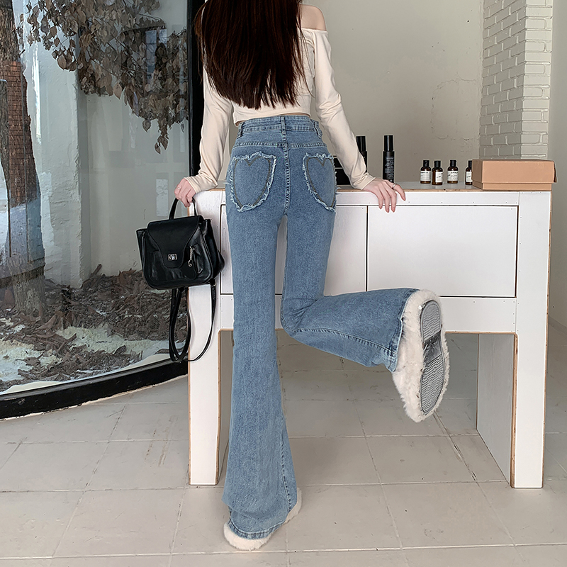 실제 ~ 마이크로 플레어 팬츠 말굽 바지 여성 하이 웨이스트 타이트 얇은 복고풍 탄성 러브 포켓 청바지